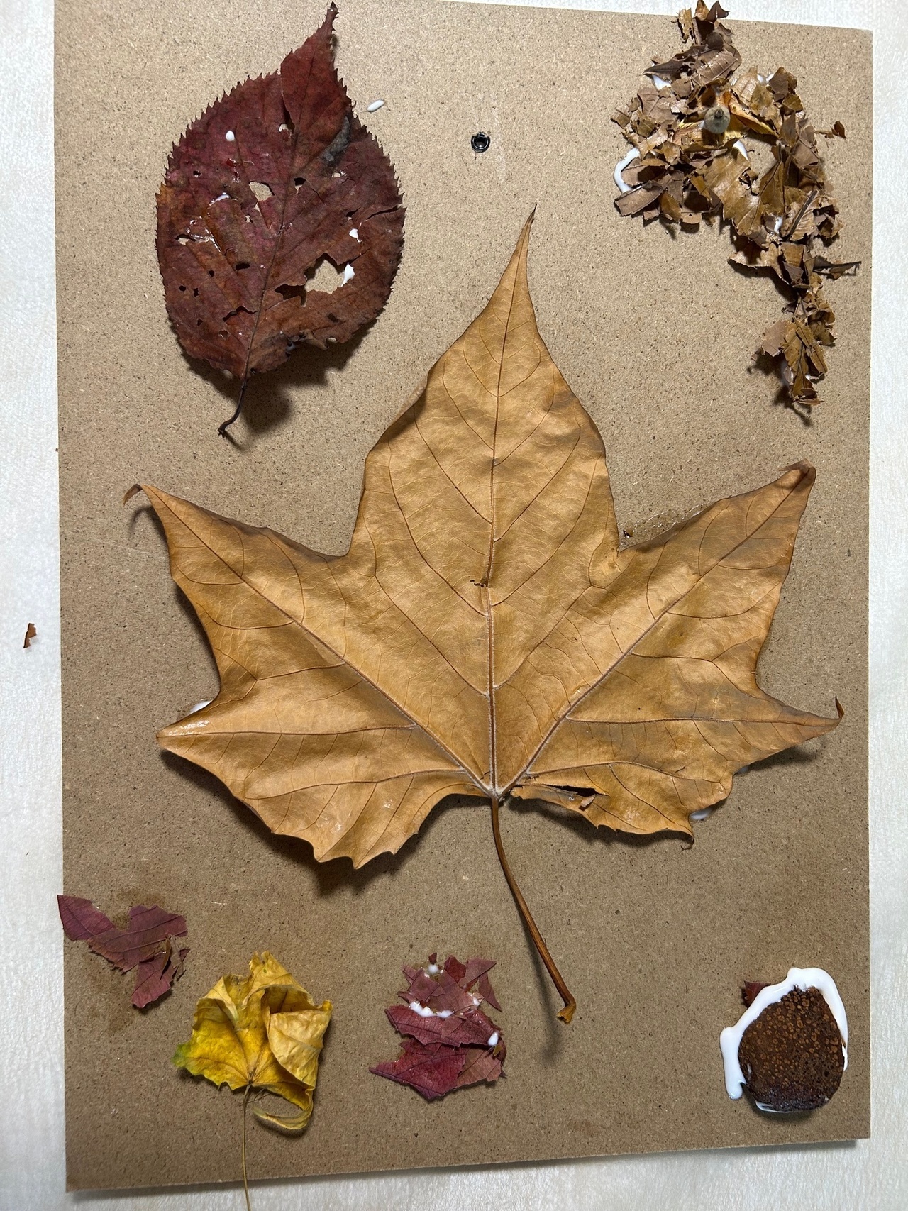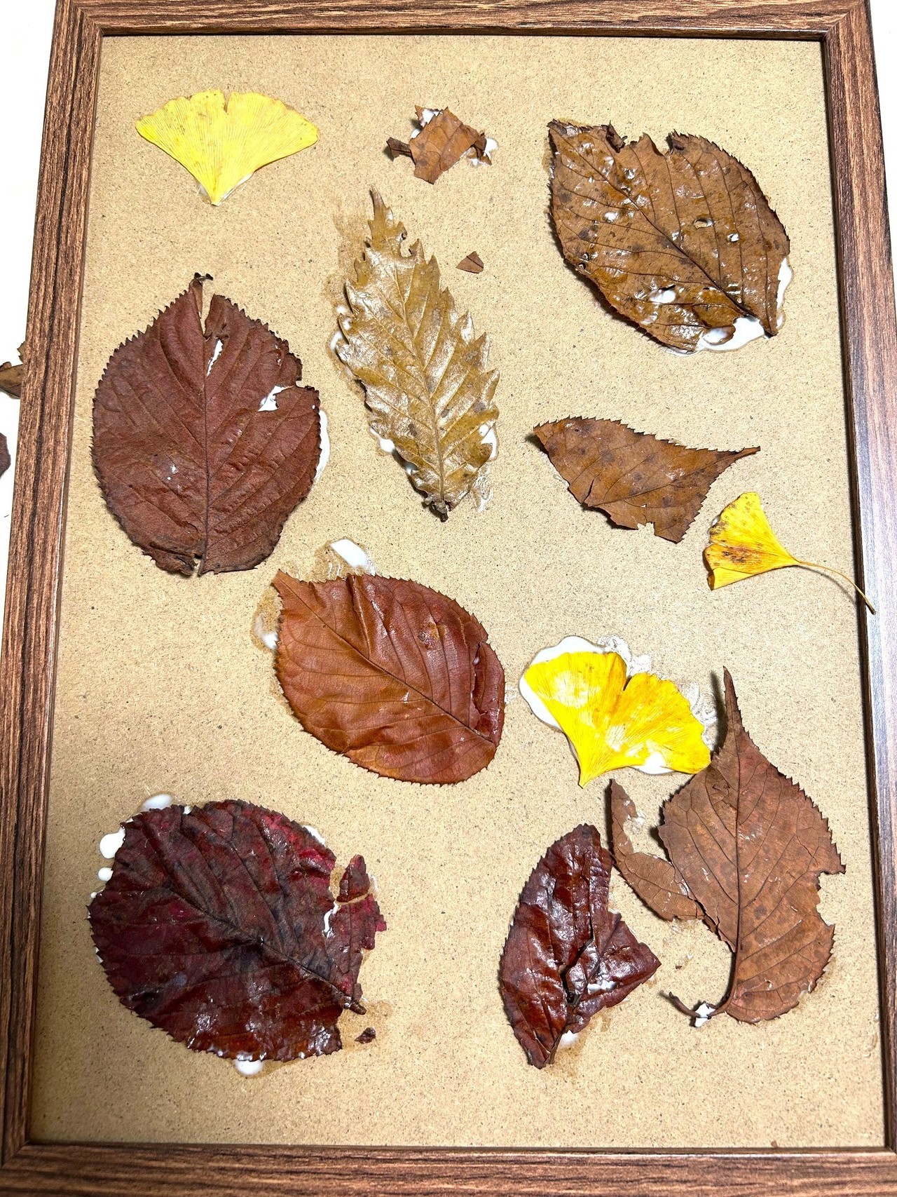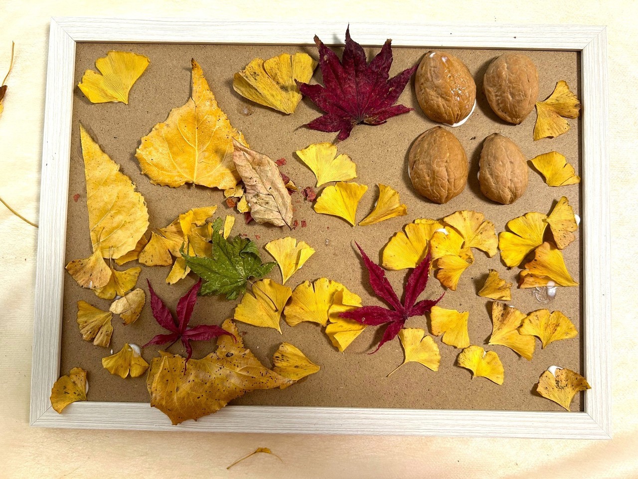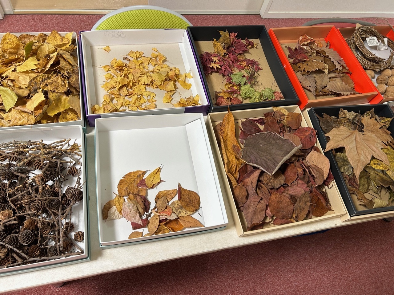 戸羽先生が拾ってきた落ち葉と木の実。ちゃんと洗って拭いて乾かして虫がついていない綺麗な状態にして用意してくれました。たくさんの落ち葉を見た子どもたちの瞳は「どれ使おうかな?!」キラキラ輝いていました。