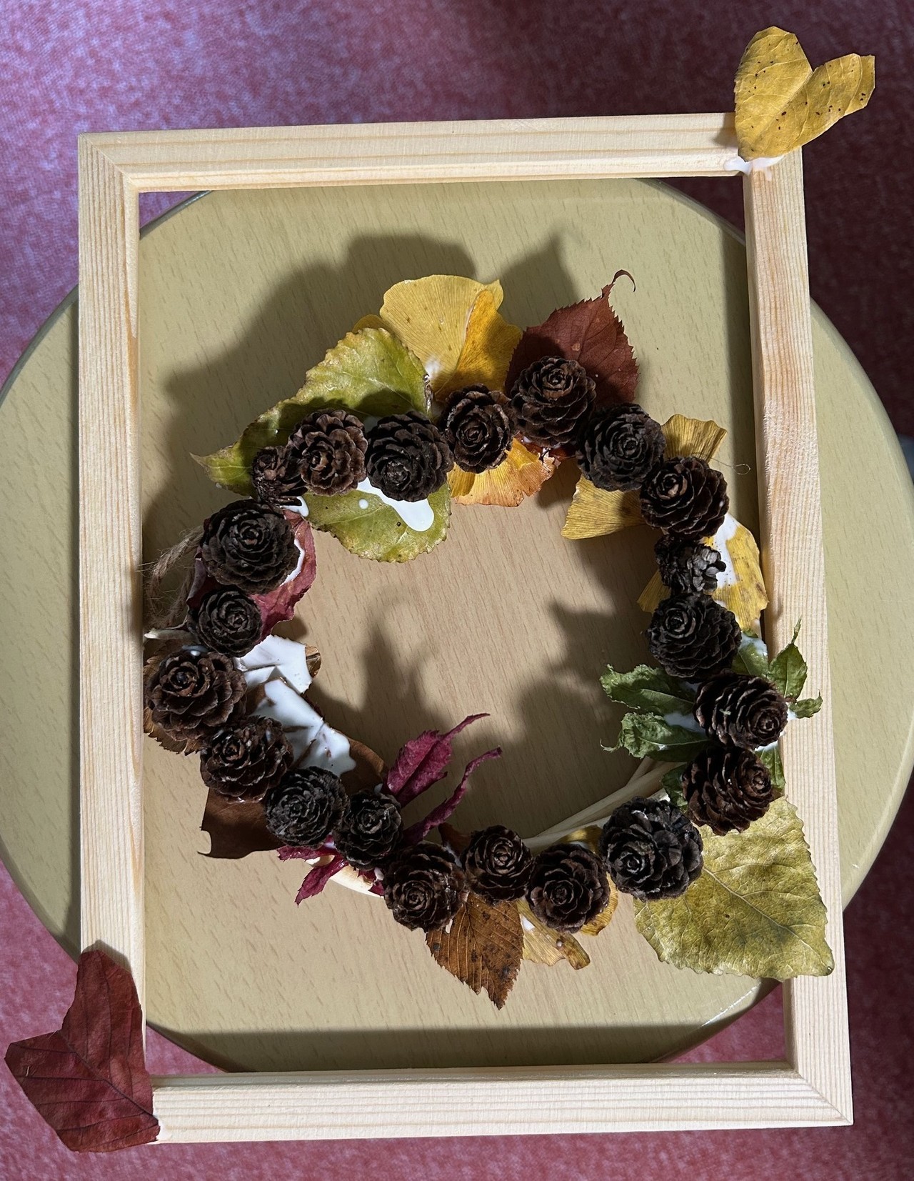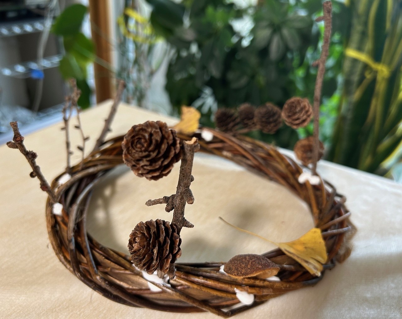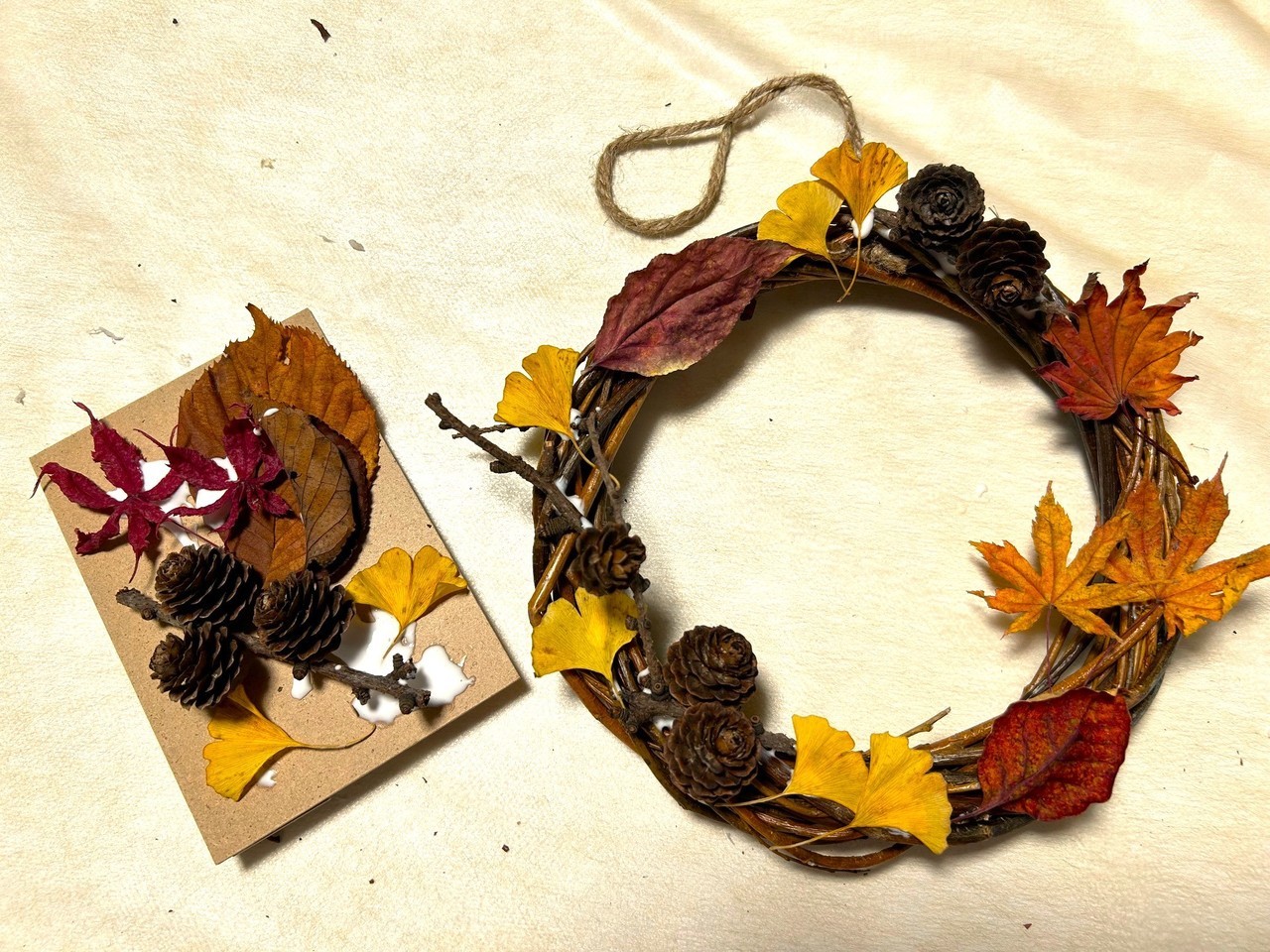 戸羽講師から「寒くなってきましたね。もうすぐ雪がやってくる季節ですが、落ち葉を使って表現するアートです。色は自然のものを使っているので赤・橙・黄などですが、組み合わせ次第では面白い作品になると思います。もう冬は始まっています。体調には気を付けてくださいね。」