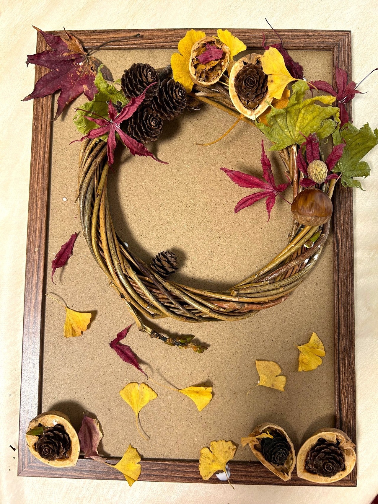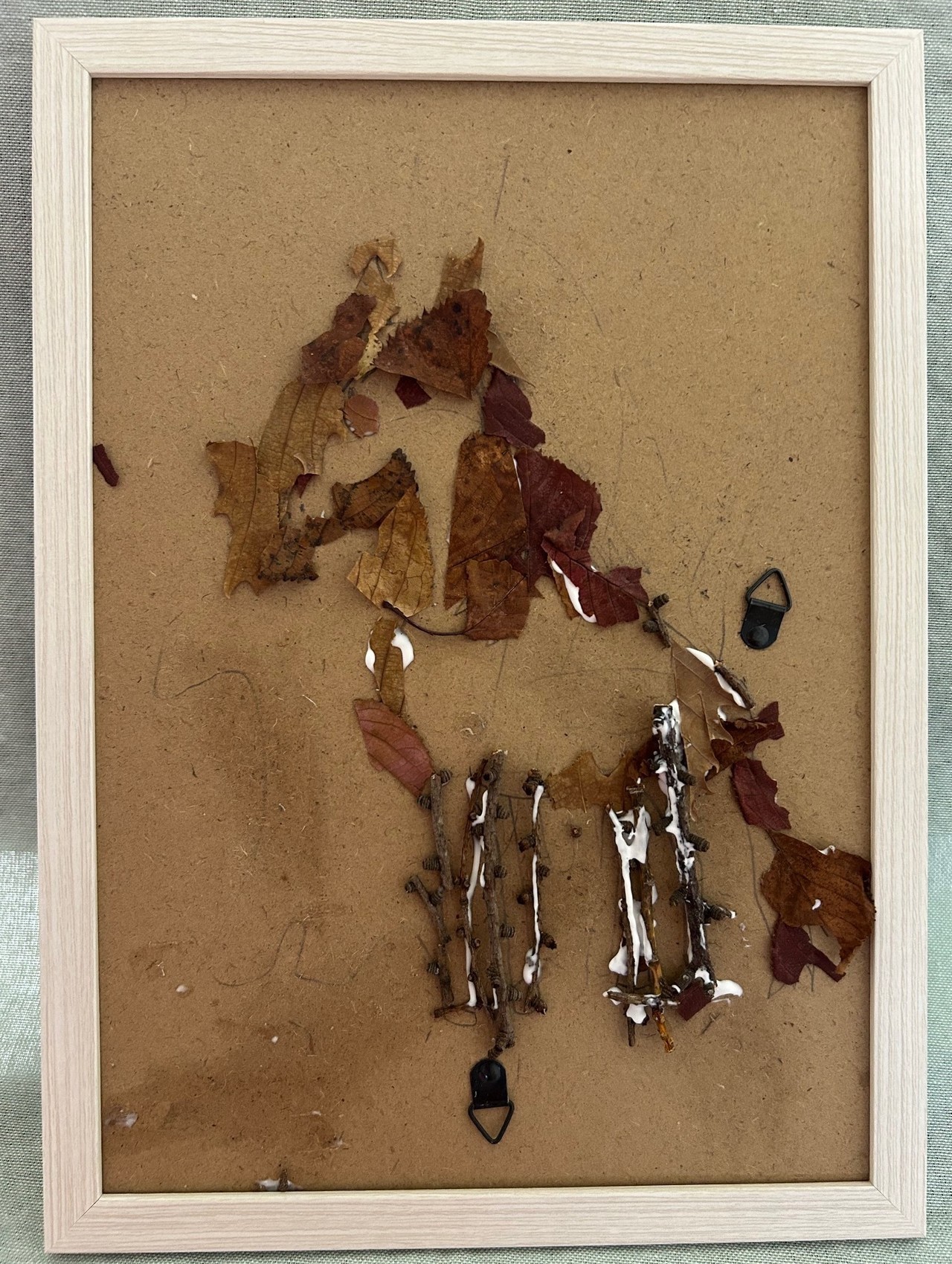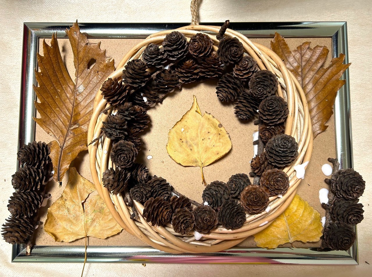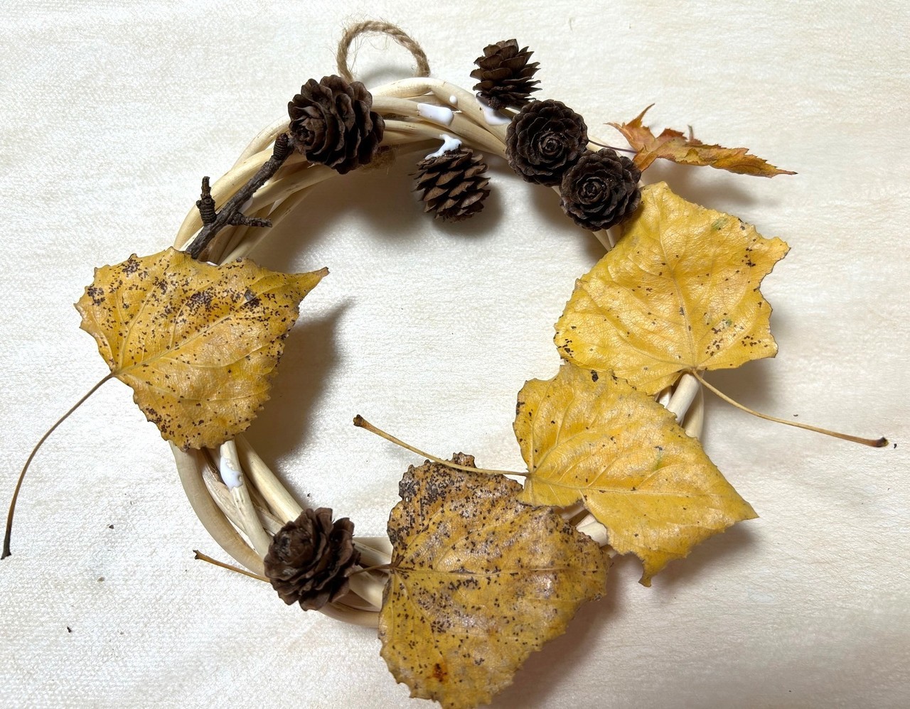 戸羽講師から「寒くなってきましたね。もうすぐ雪がやってくる季節ですが、落ち葉を使って表現するアートです。色は自然のものを使っているので赤・橙・黄などですが、組み合わせ次第では面白い作品になると思います。もう冬は始まっています。体調には気を付けてくださいね。」
