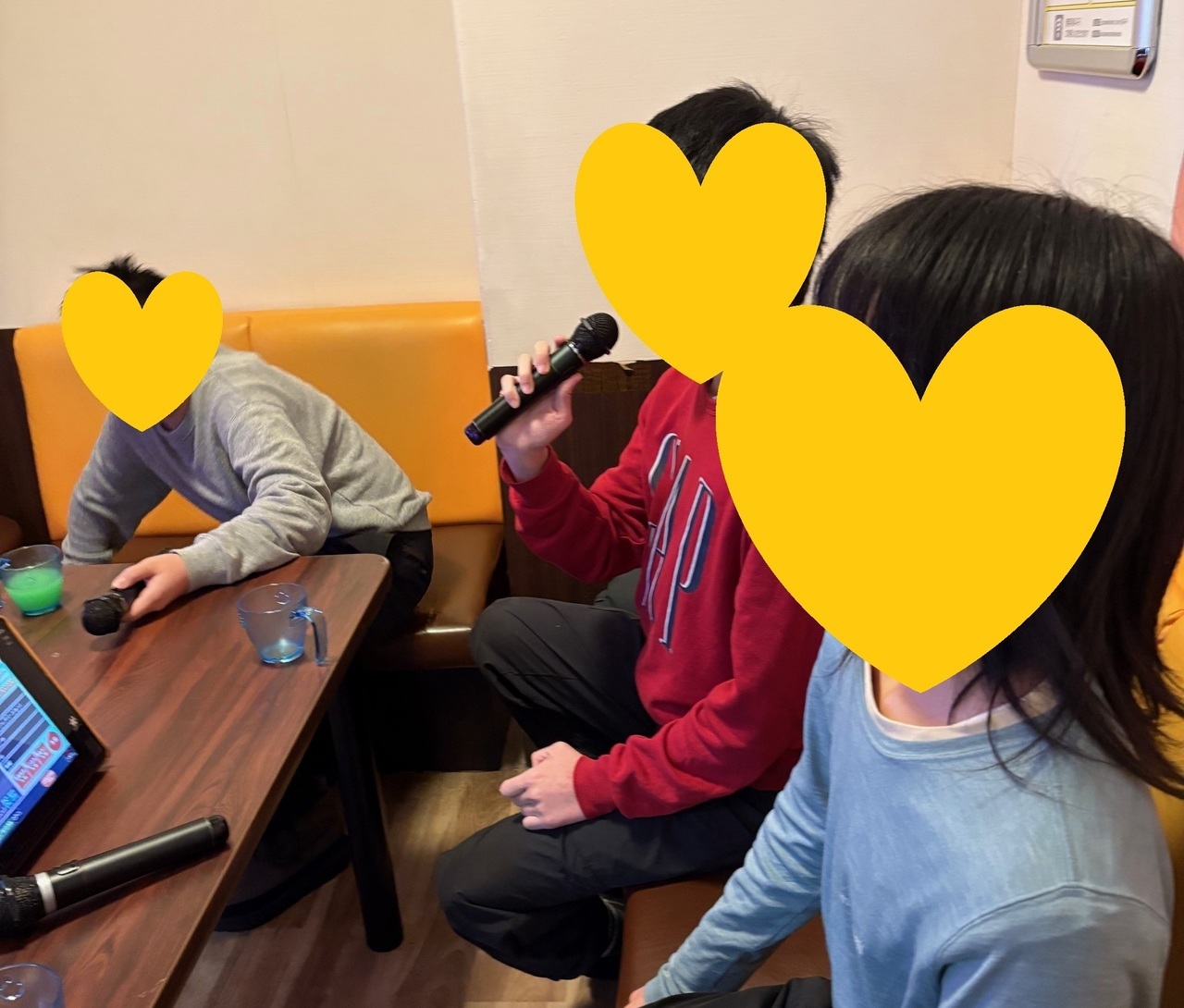 最初に全員でビジョントレーニングをし、眼球の動きを良くすることで歌詞を追いやすくしました。自分でドリンクバーを利用する練習など施設のルールやマナーを守りながら小集団で楽しく過ごすことを目的としたSSTです。他児の良さを見つけ異年齢間のコミュニケーションも心がけました。デイに戻ってからは振り返りをして感想を発表しました。いろんな歌を知ったり、曲の映像を見て盛り上がるなど、楽しい時間を過ごしました。